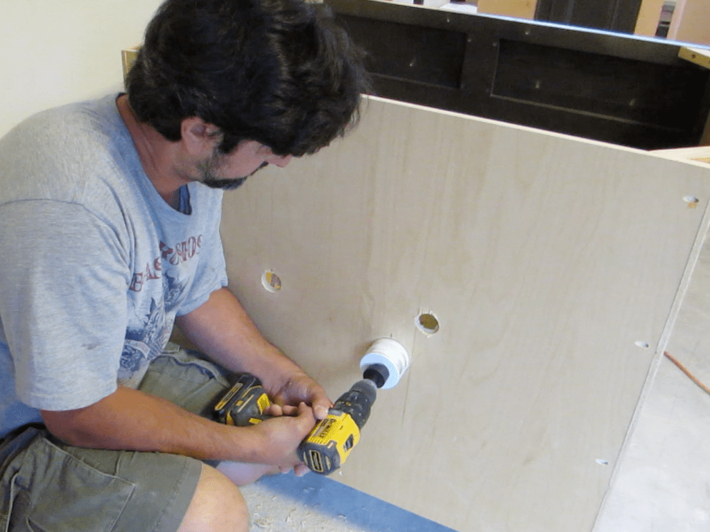 Keep in mind that whatever way you do this it will be visible from inside when you open the cabinet doors. I like the cut to be as hidden as possible. That’s why I like to make the holes as subtle as possible. This can be done with a tool you attach to your drill called a hole saw. Lets take a closer look at the process of drilling these holes for the plumbing to go through.