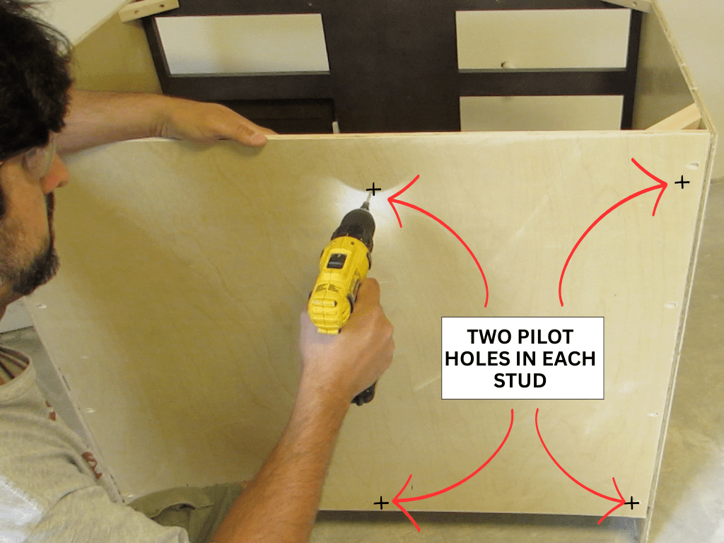 Get one of the 3 inch screws started in each hole from the inside of the cabinet. Don’t let it poke out the back because this may make it hard to accurately position the cabinet. Keep the drill inside the cabinet during the next steps. You will be using it soon.