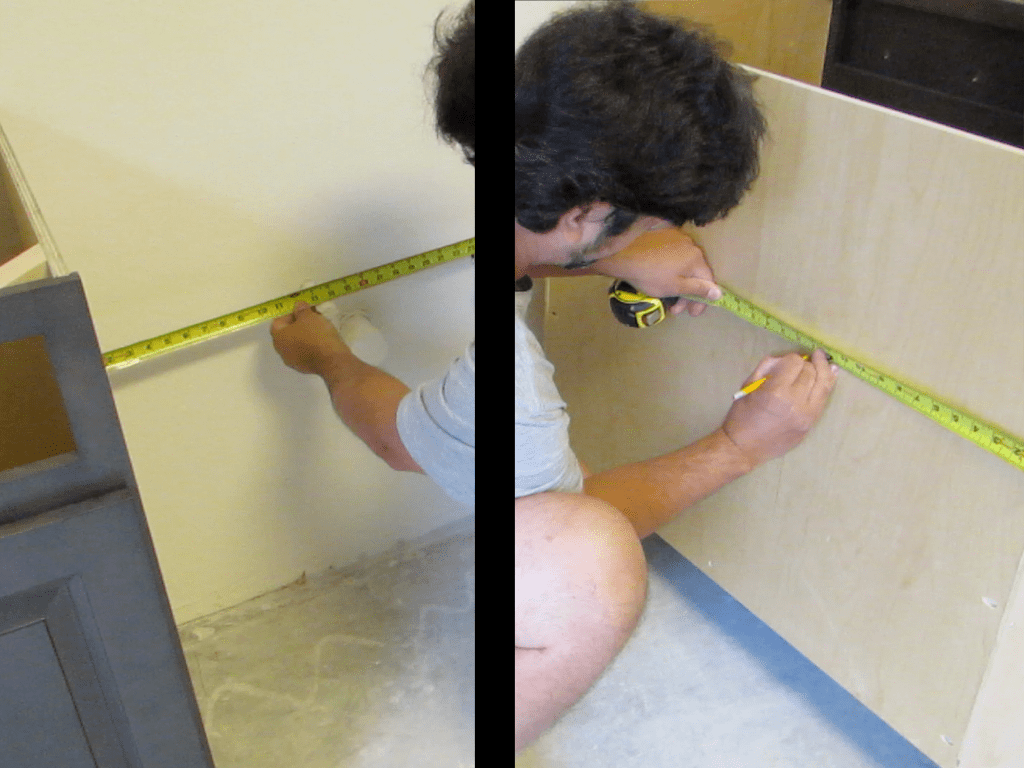 The location for each hole will need to be transferred onto the back of the cabinet. To do this you will need two reference points to use. These can be a cabinet directly next to this one that’s already installed, and the floor.