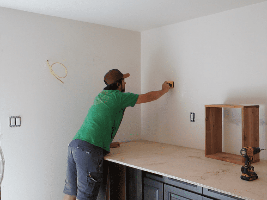 One of the easiest methods of hanging upper cabinets at the correct height is to build what I like to call an upper cabinet support box. The concept is simple. It’s a wooden box that is the exact height needed to hold the cabinets in place as you install them.