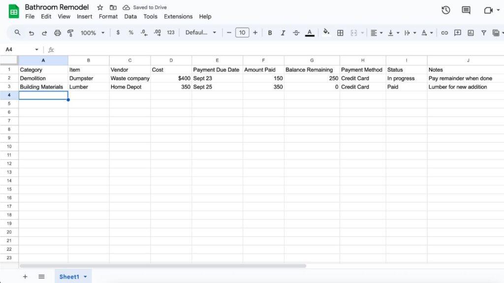 The cell you previously chose should have a value in it for you. Use this value to calculate the Balance Remaining value after each of the expenses were paid. This column will help you figure out exactly how to plan a remodel on a budget.