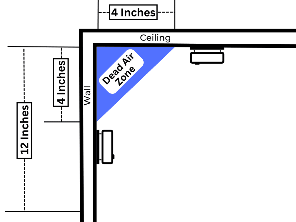 Smoke detector placement on the ceiling is ideal if the edge is at least 4 inches from the wall. The corners of the room are considered a dead air zone. It’s also good to have them in front of, or near to the room’s main doorway. This will help sound the alarm if any smoke from outside the room travels through the doorway.